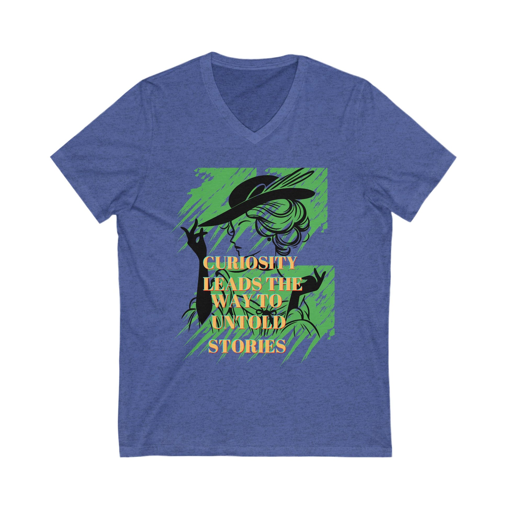 Curiosity V-Neck Tee - Unisex Inspirational Shirt for Story Lovers. This lightweight custom v-neck t-shirt offers a comfortable wearing experience and a stylish silhouette fit for any season. Perfect for adults who love stories and seek inspiration. Ideal for casual wear, semi-formal occasions, and as a thoughtful gift for book lovers and writers. Relevant for birthdays, holidays, and book club gatherings.