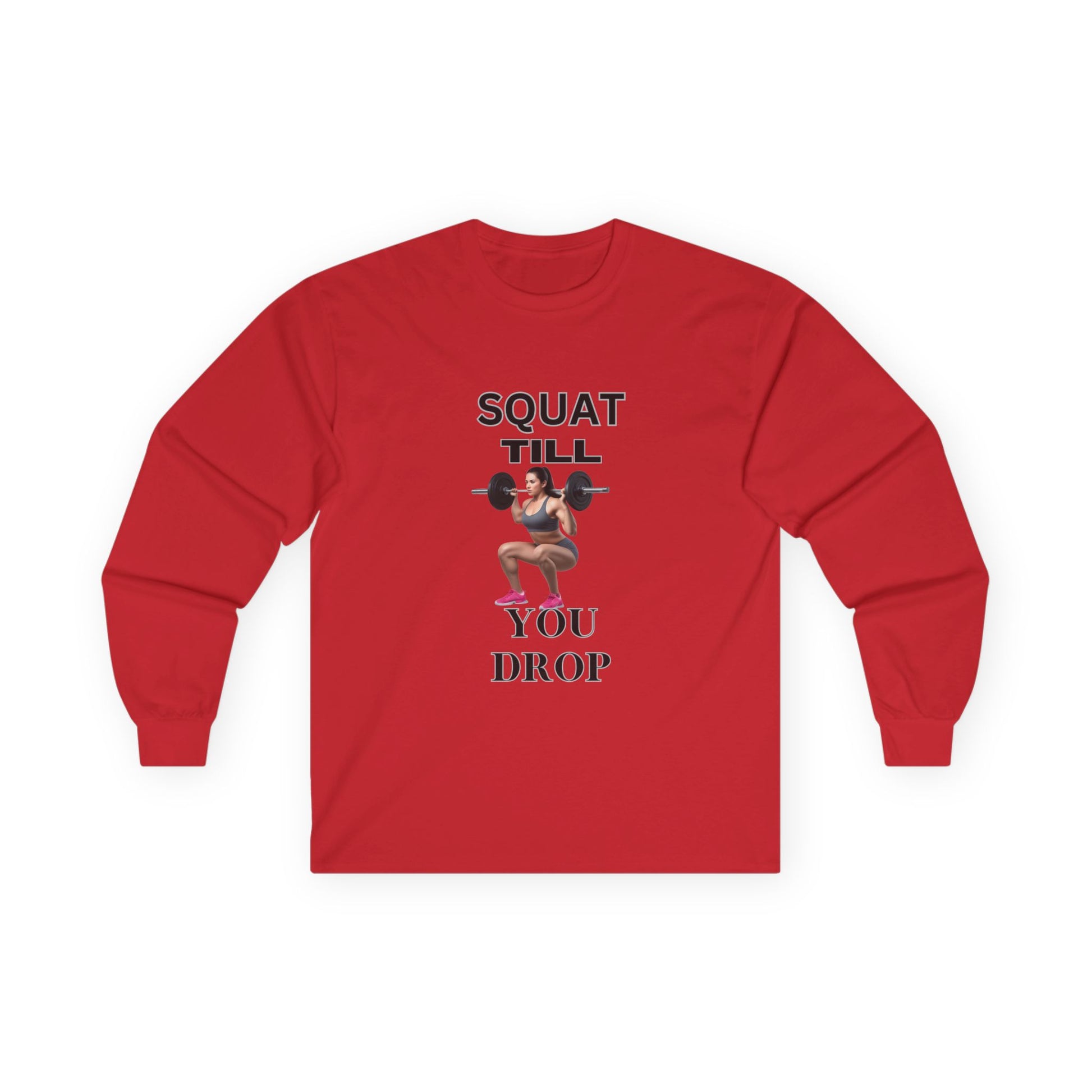 Stay motivated and stylish while working out with this 'Squat Till You Drop' fitness long sleeve tee. Perfect for fitness enthusiasts who want to add a touch of inspiration to their workout wardrobe. Ideal for gym-goers, athletes, and those who enjoy staying active. Great for wearing during workout sessions, gym visits, or casual outings.