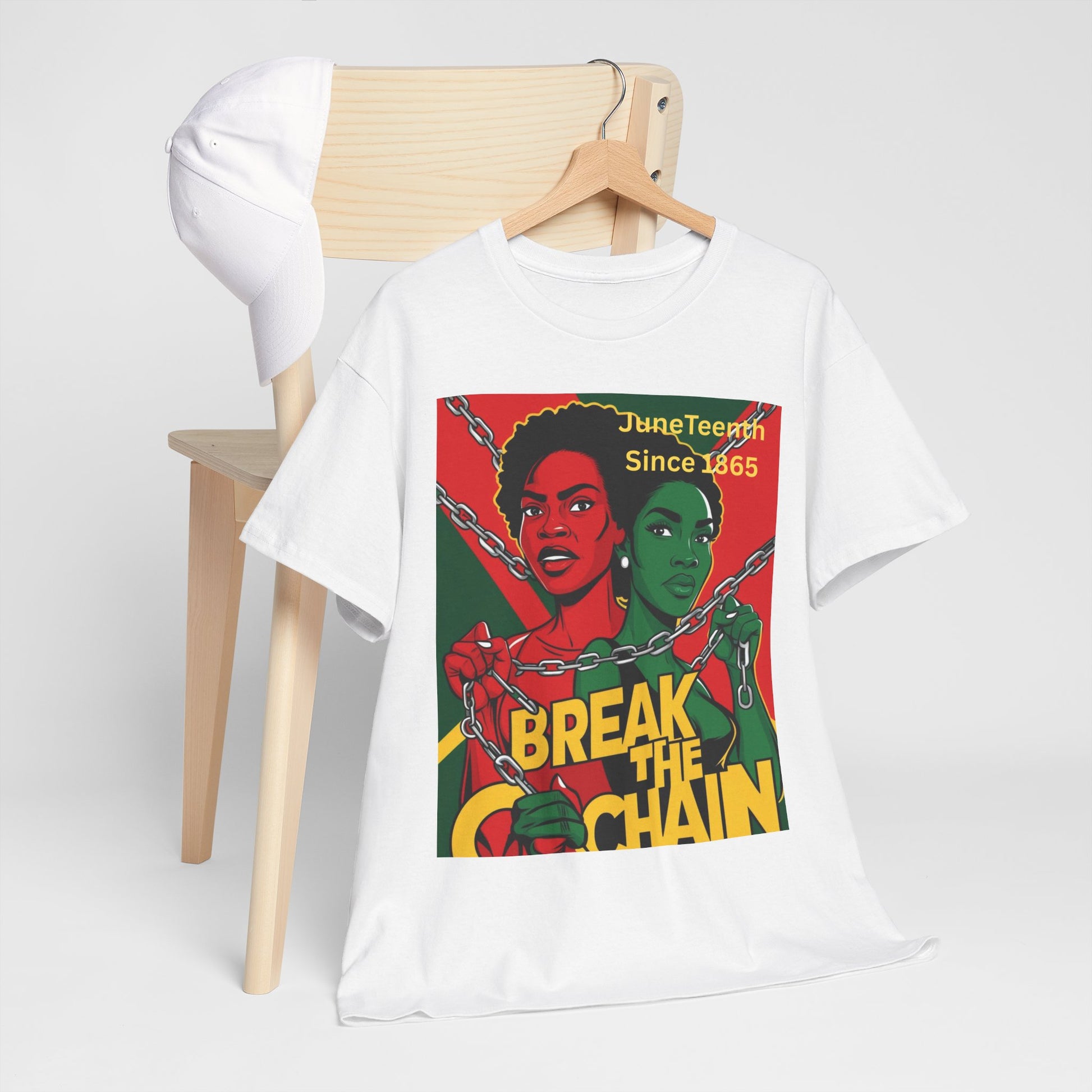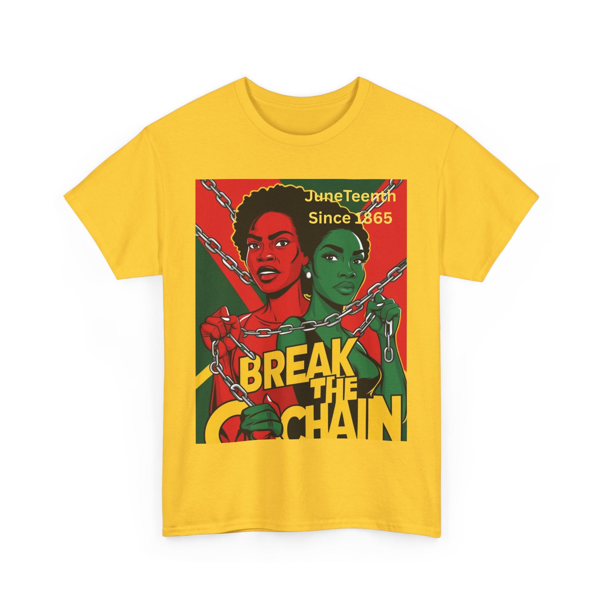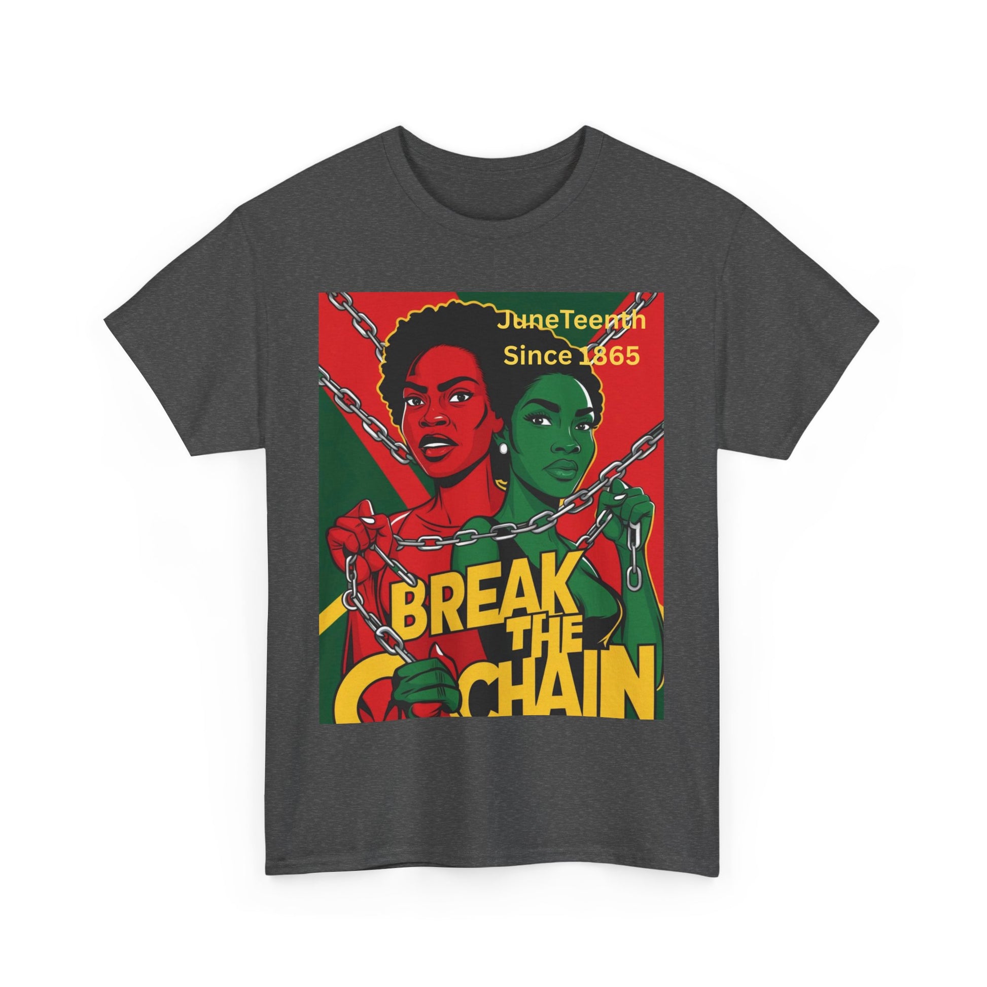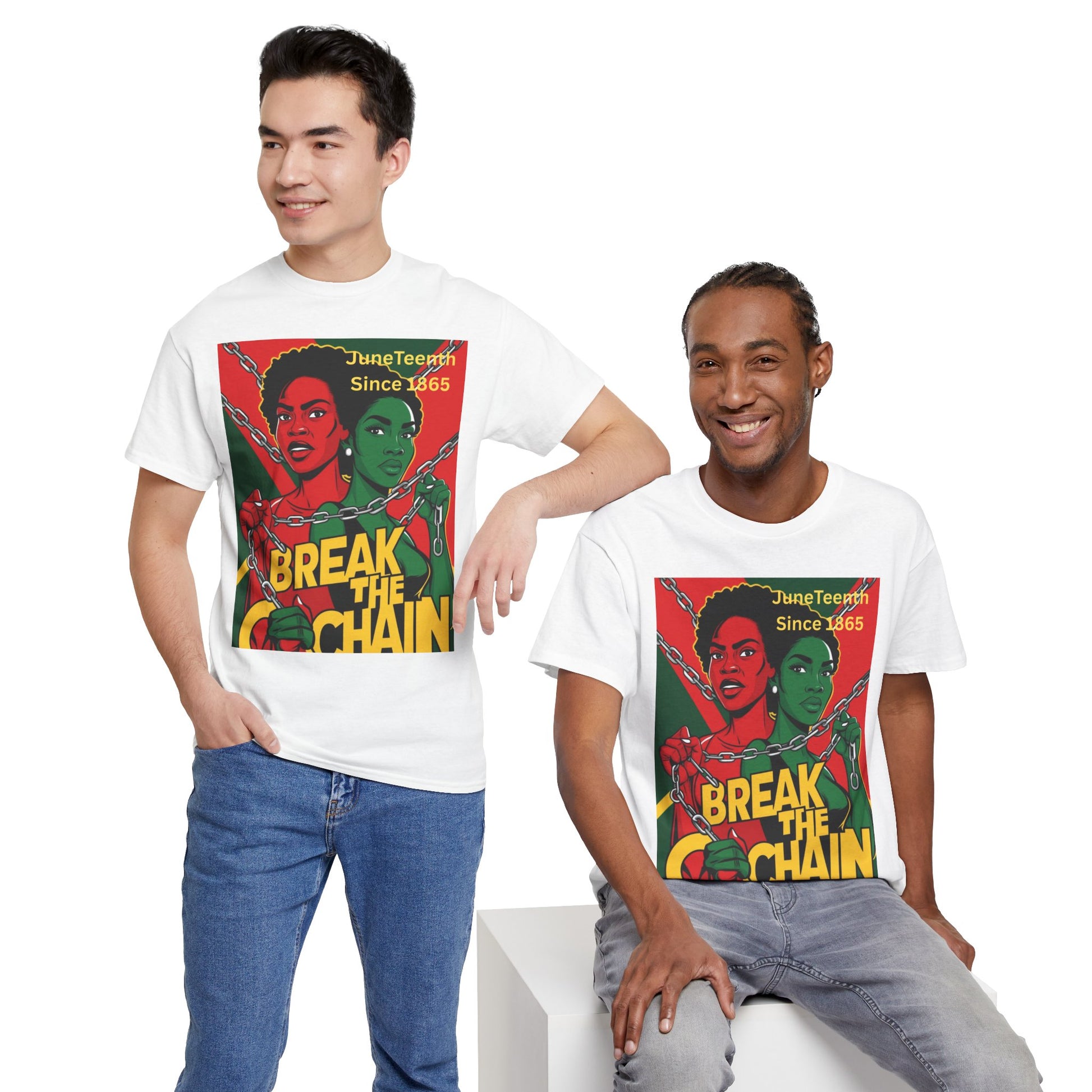 Celebrate Juneteenth in style with this Break the Chain Unisex Heavy Cotton Tee. Made from specially spun fibers, this tee is strong, smooth, and perfect for printing. The classic fit and crew neckline ensure a comfy, relaxed wear for adults at any occasion.