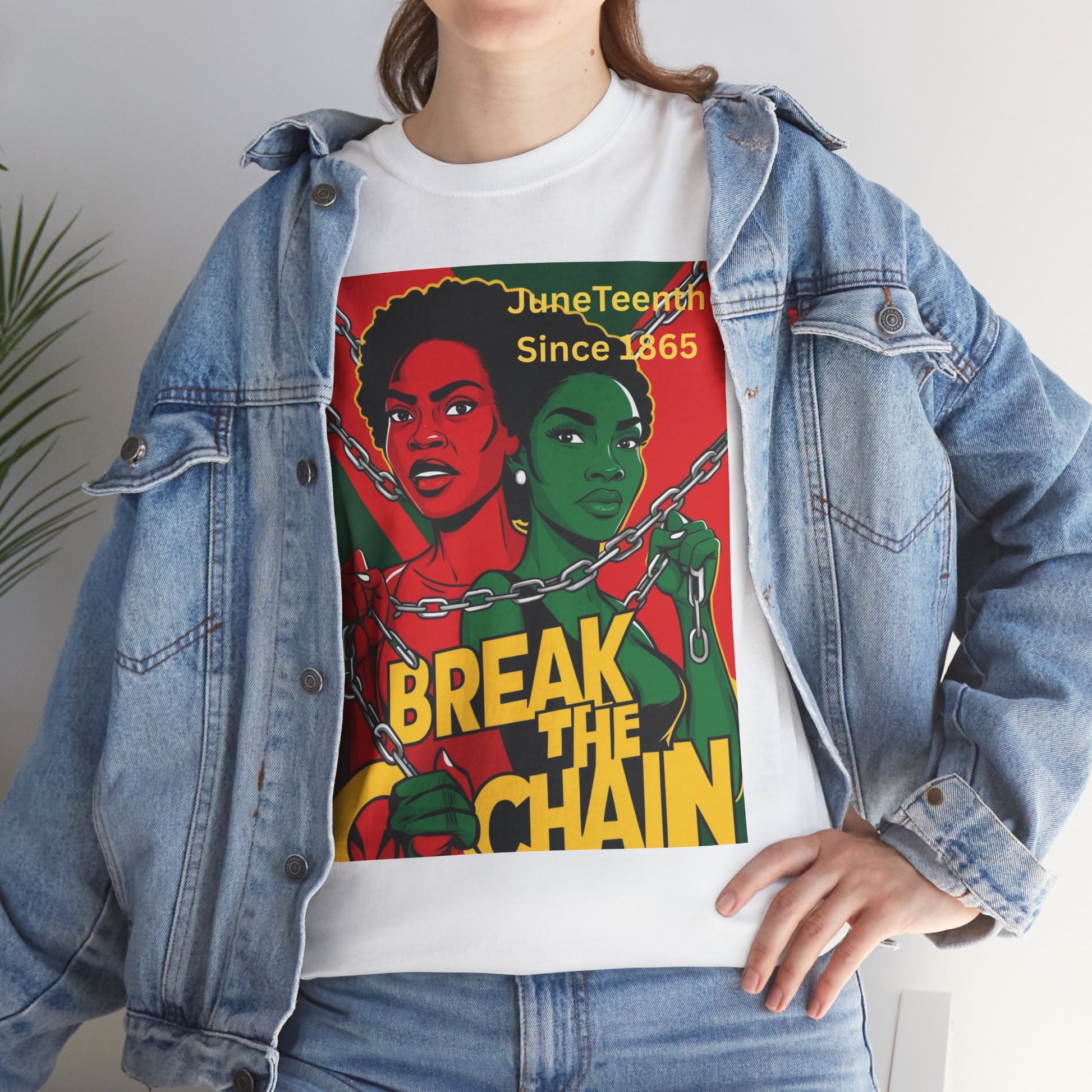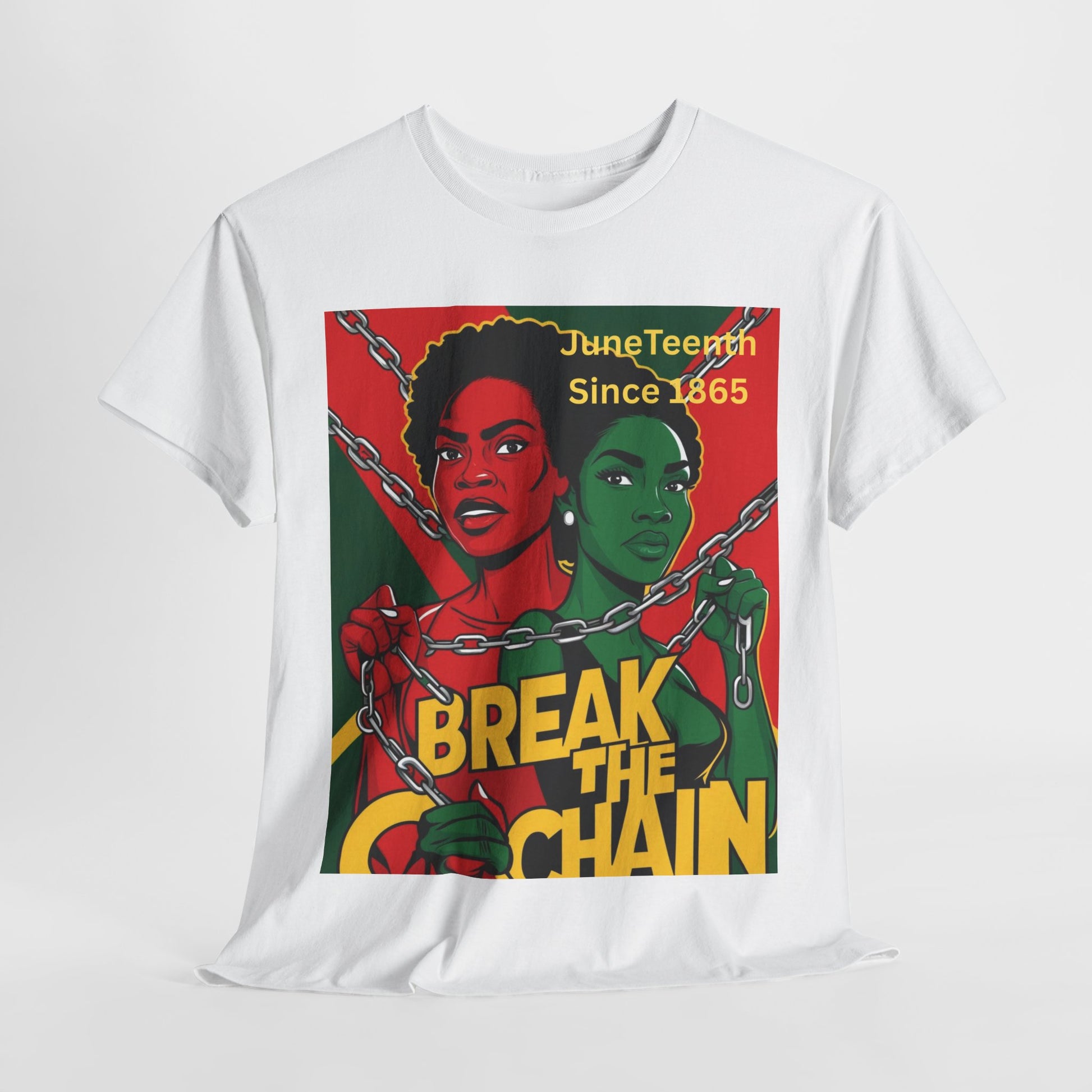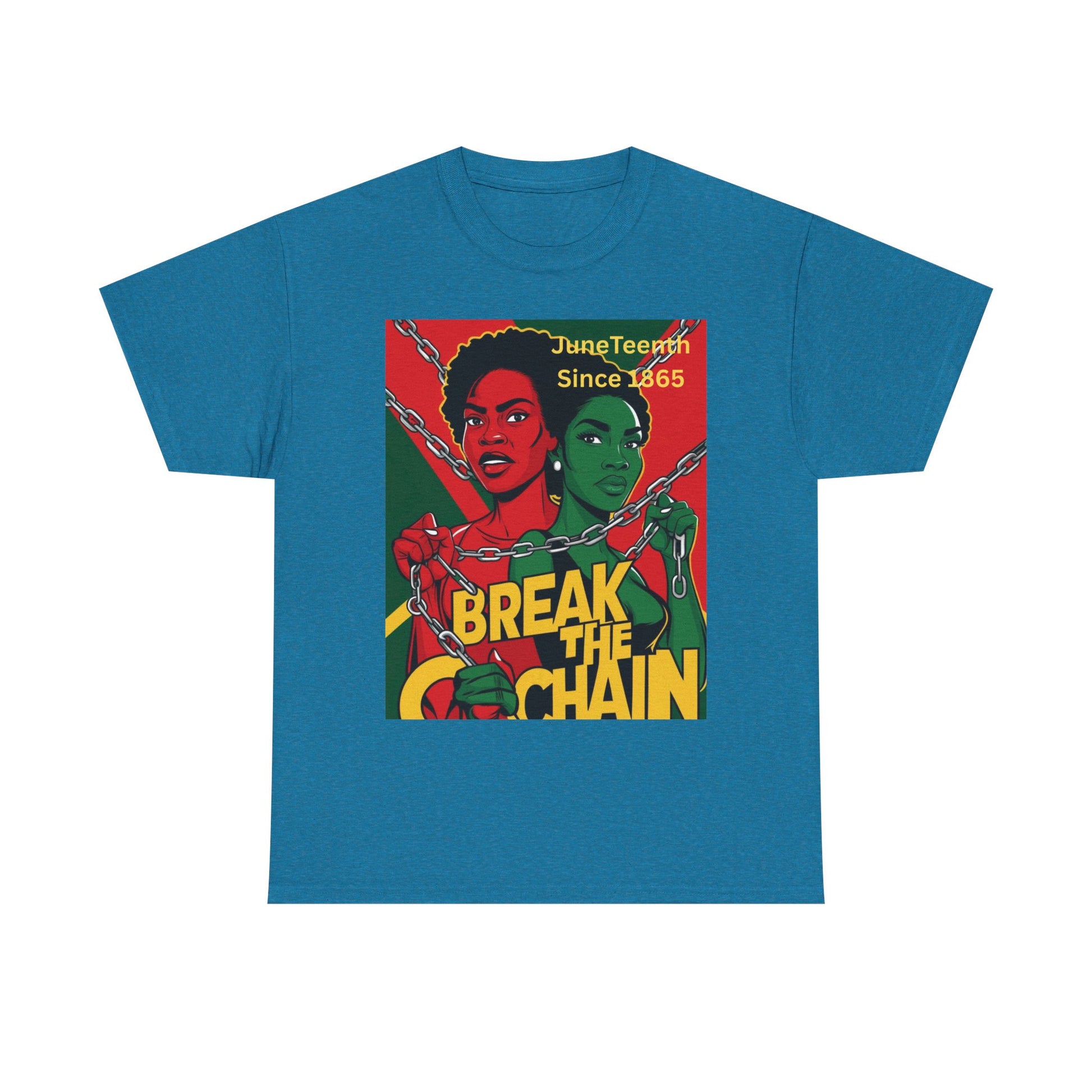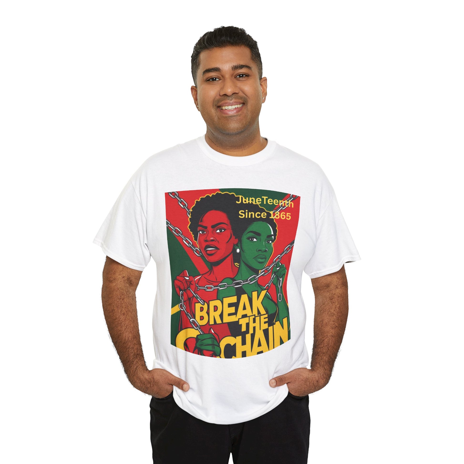 Celebrate Juneteenth in style with this Break the Chain Unisex Heavy Cotton Tee. Made from specially spun fibers, this tee is strong, smooth, and perfect for printing. The classic fit and crew neckline ensure a comfy, relaxed wear for adults at any occasion.