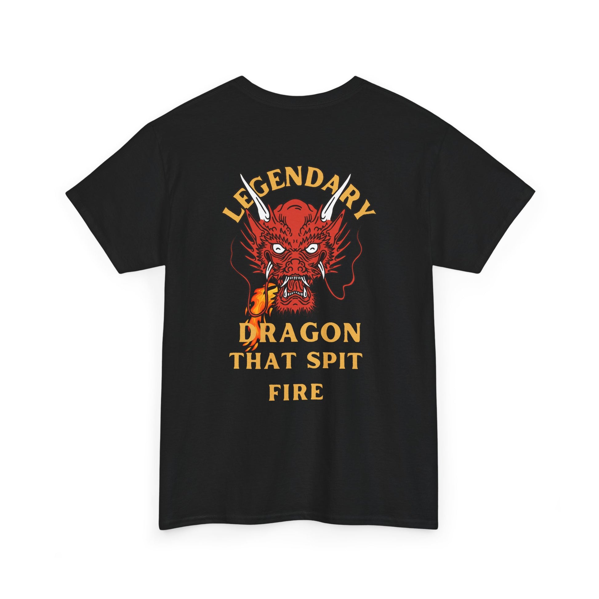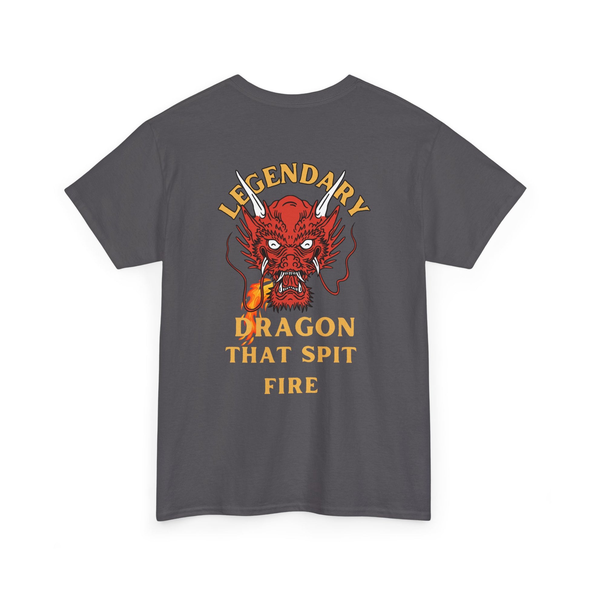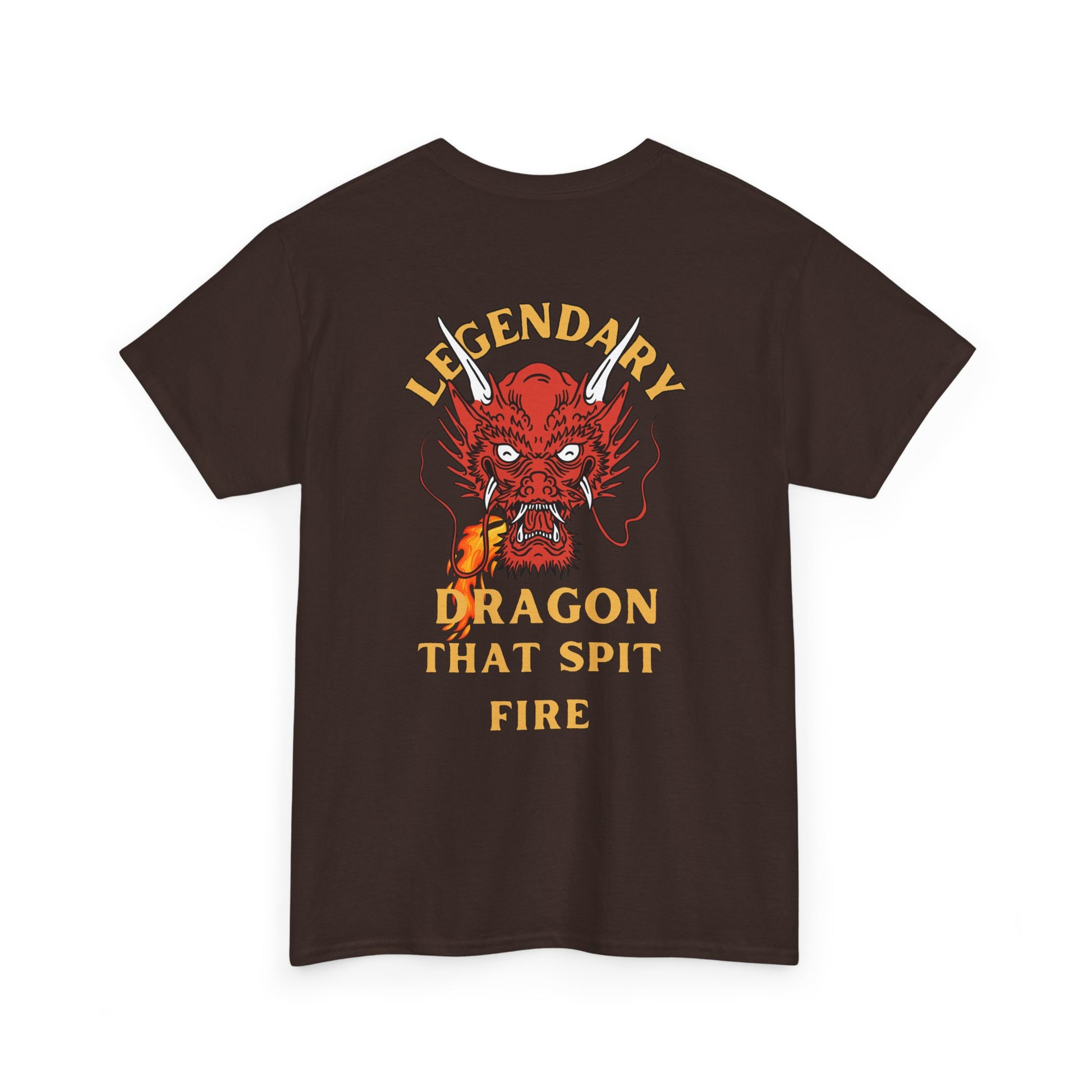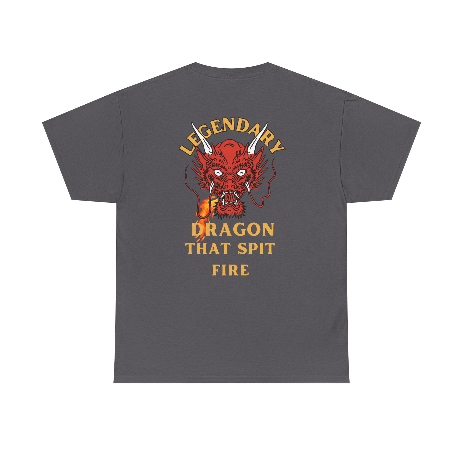 Legendary Dragon Spit Fire T-Shirt - Bold and Eye-Catching Graphic Tee for Dragon Lovers. This tee gives off a fierce and mythical vibe, perfect for fans of dragons and fantasy. Ideal for casual wear or as a statement piece for dragon-themed events and conventions.