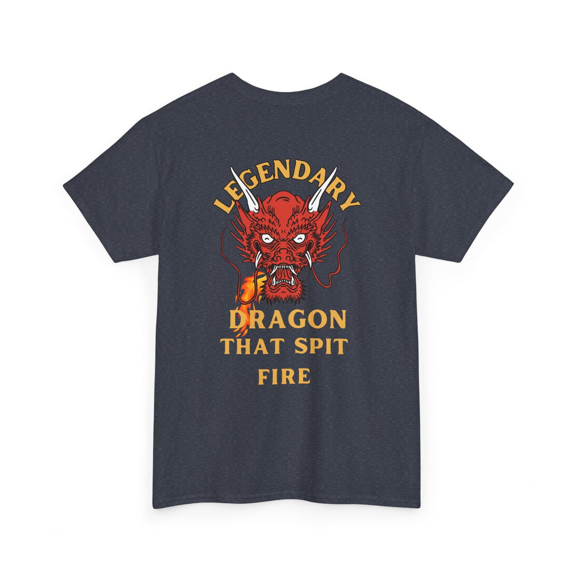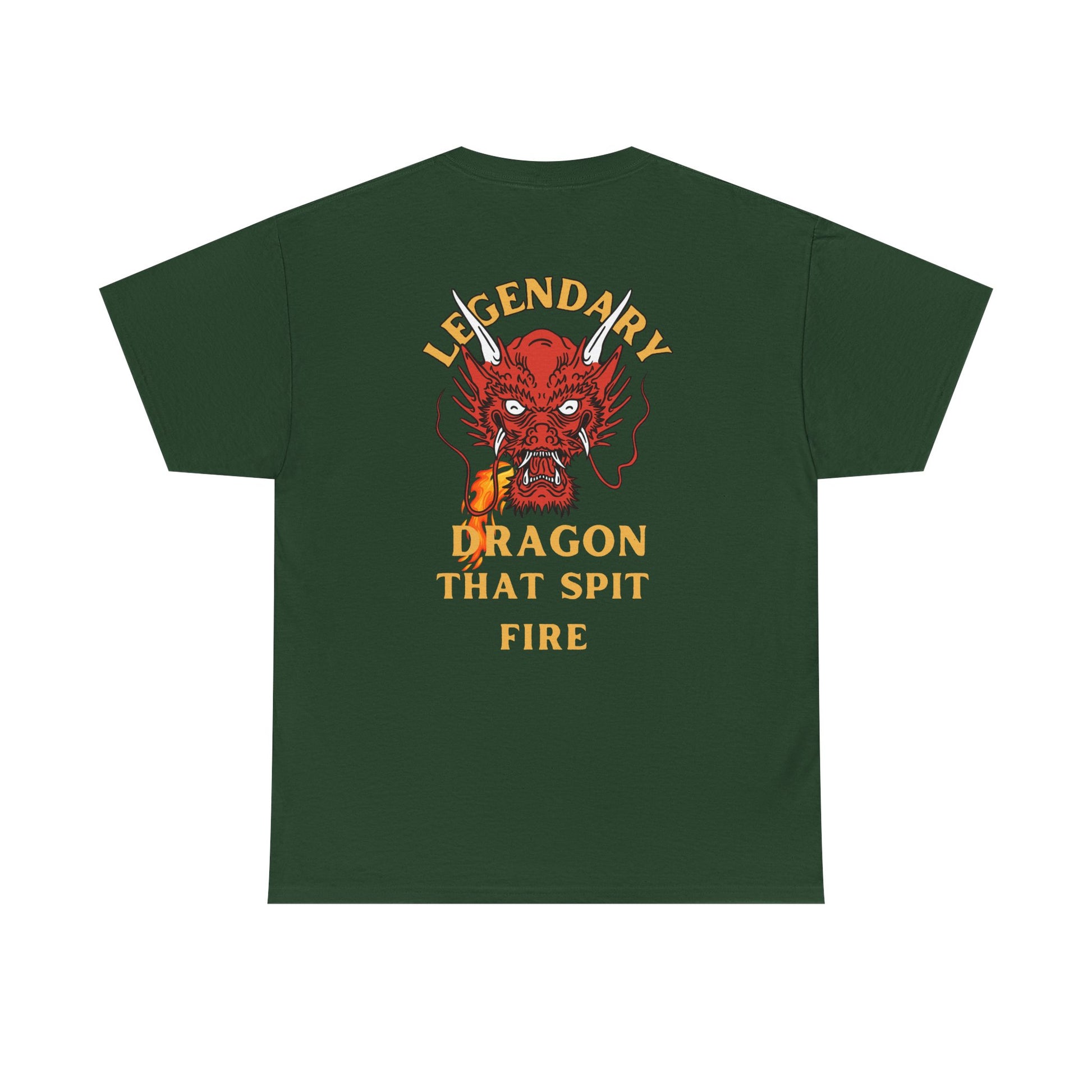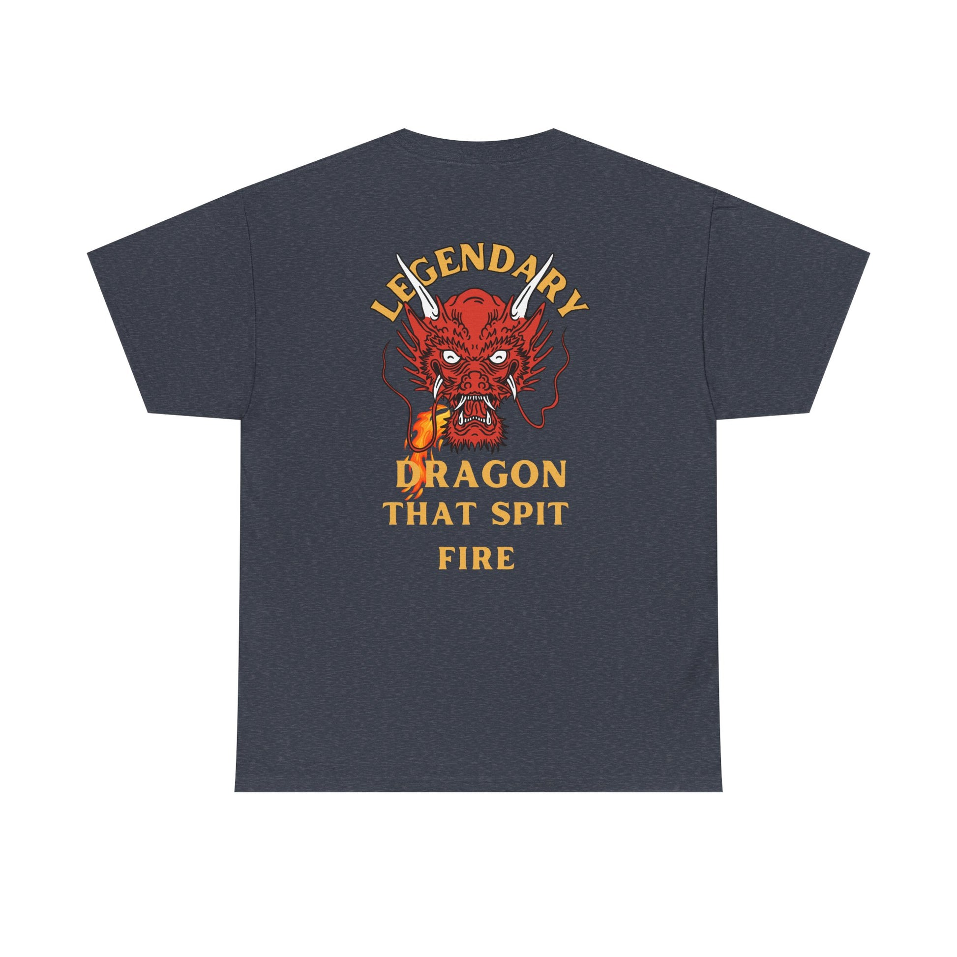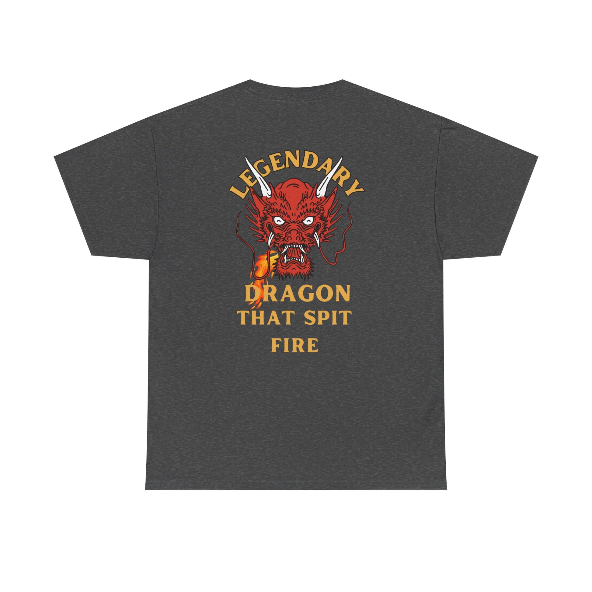 Legendary Dragon Spit Fire T-Shirt - Bold and Eye-Catching Graphic Tee for Dragon Lovers. This tee gives off a fierce and mythical vibe, perfect for fans of dragons and fantasy. Ideal for casual wear or as a statement piece for dragon-themed events and conventions.