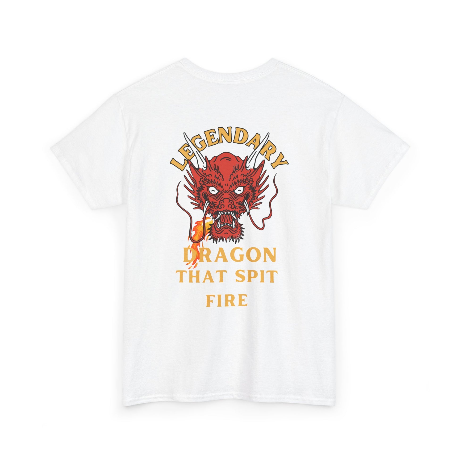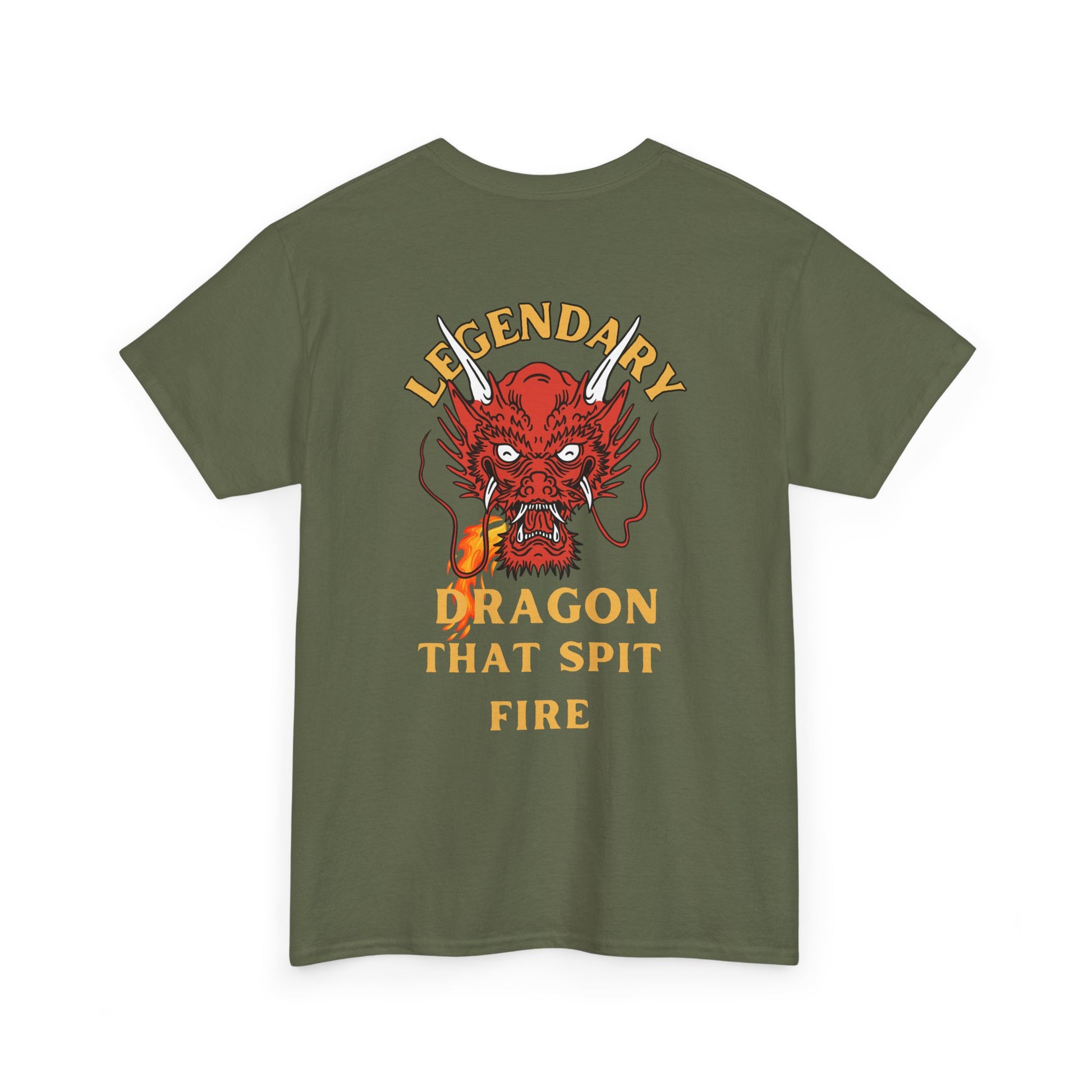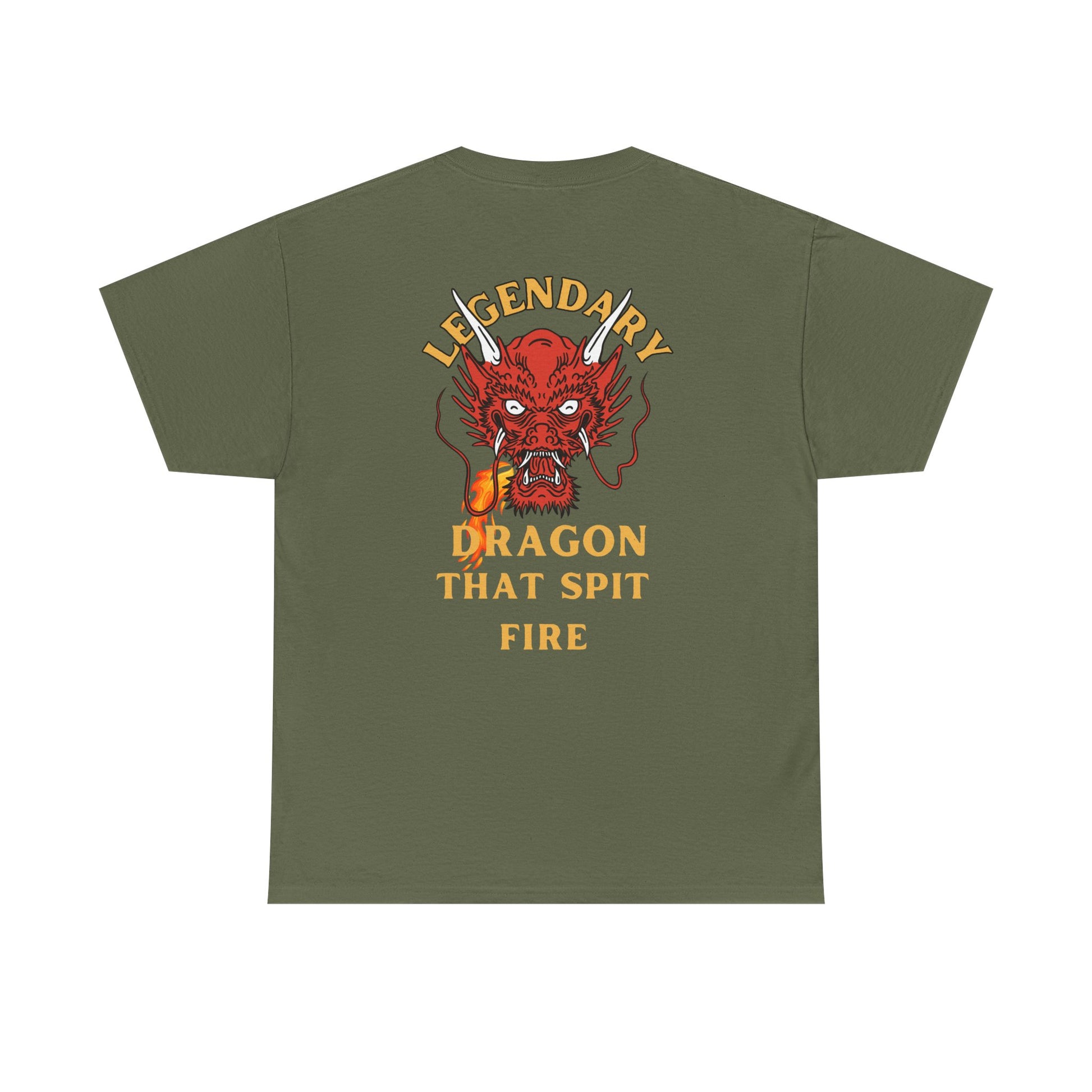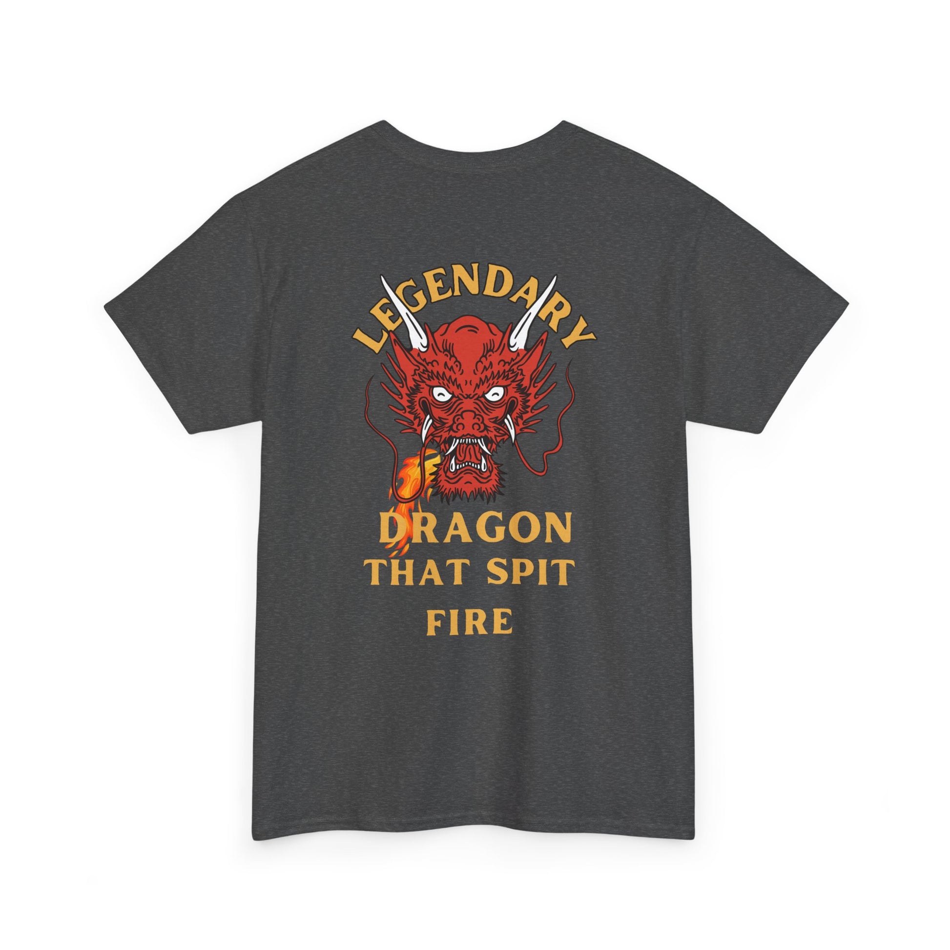 Legendary Dragon Spit Fire T-Shirt - Bold and Eye-Catching Graphic Tee for Dragon Lovers. This tee gives off a fierce and mythical vibe, perfect for fans of dragons and fantasy. Ideal for casual wear or as a statement piece for dragon-themed events and conventions.