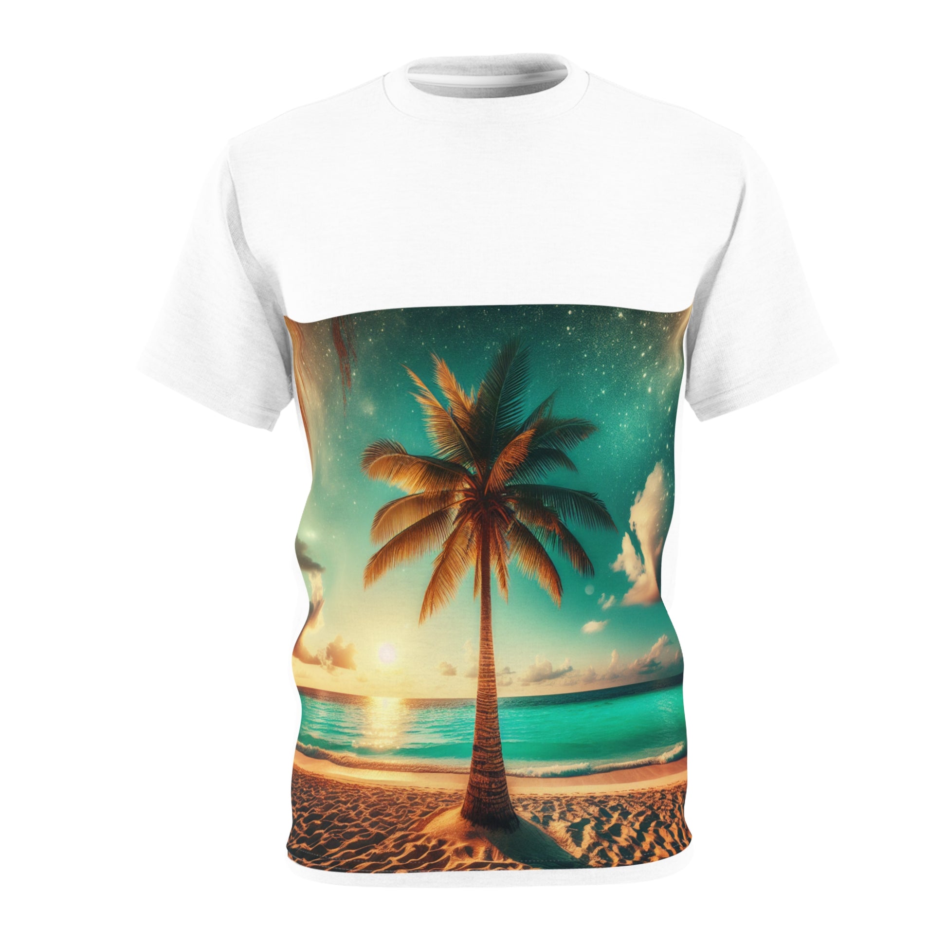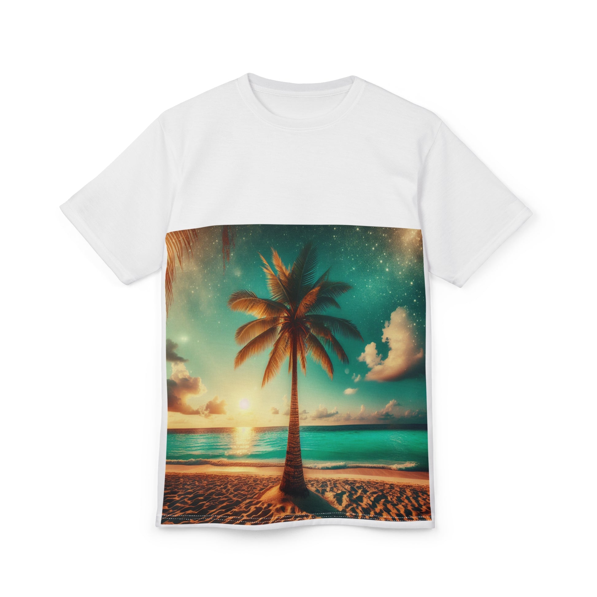 Tropical Paradise Tee with beach vibes and palm tree design, perfect for those who love tropical getaways. Ideal for beachgoers, vacation lovers, and summer enthusiasts. Relevant for summer vacations, beach trips, and tropical-themed parties.