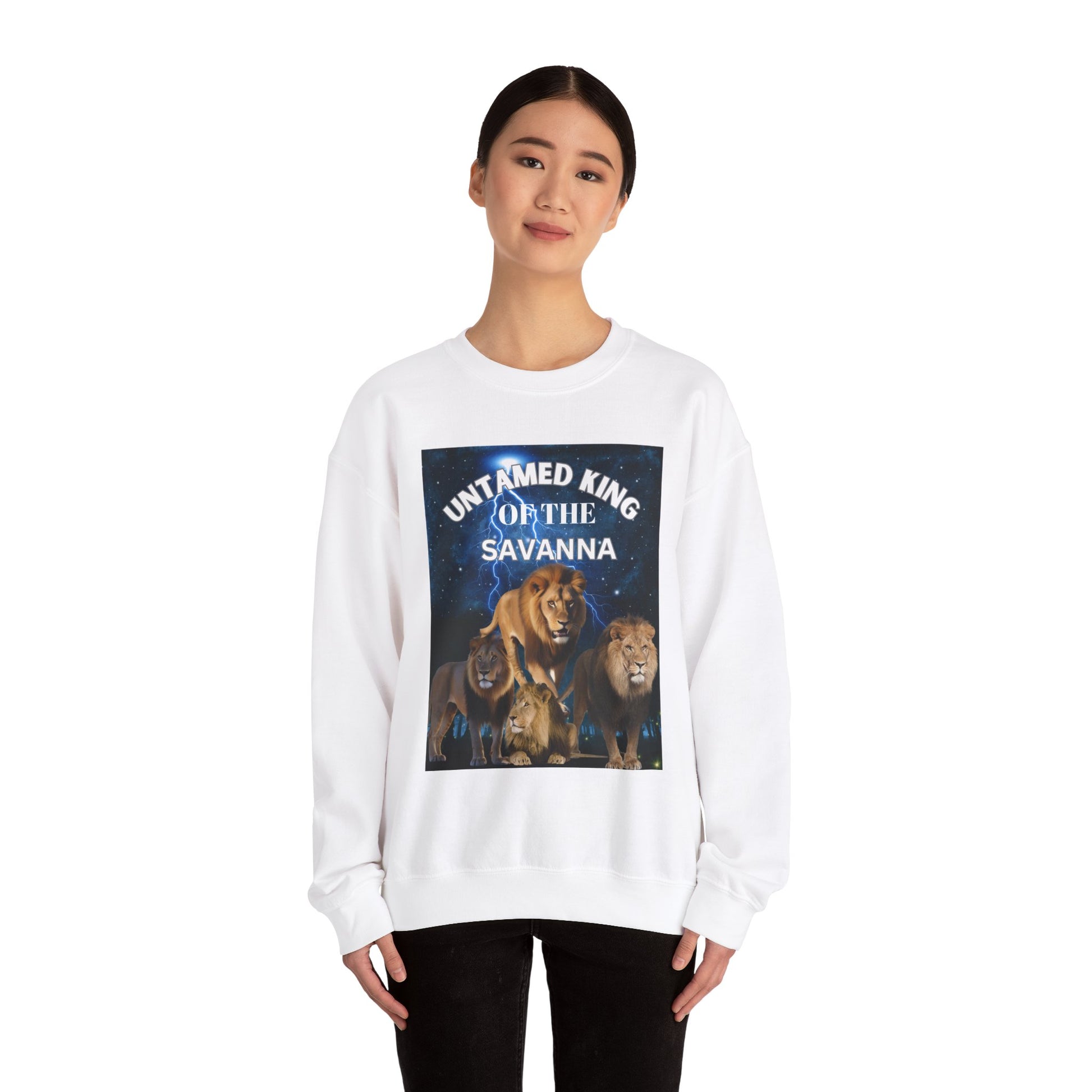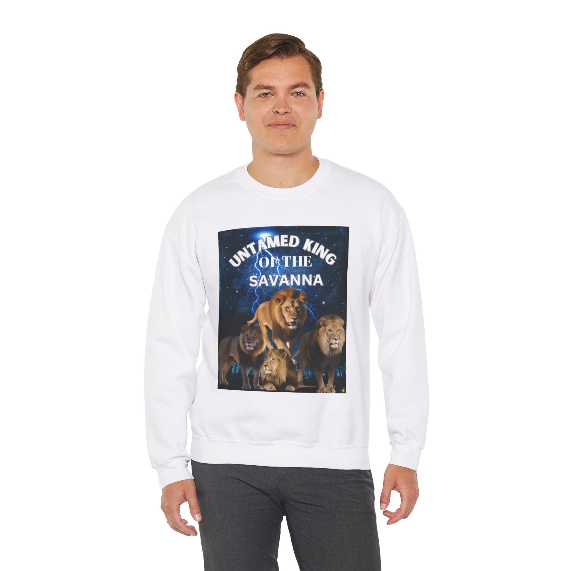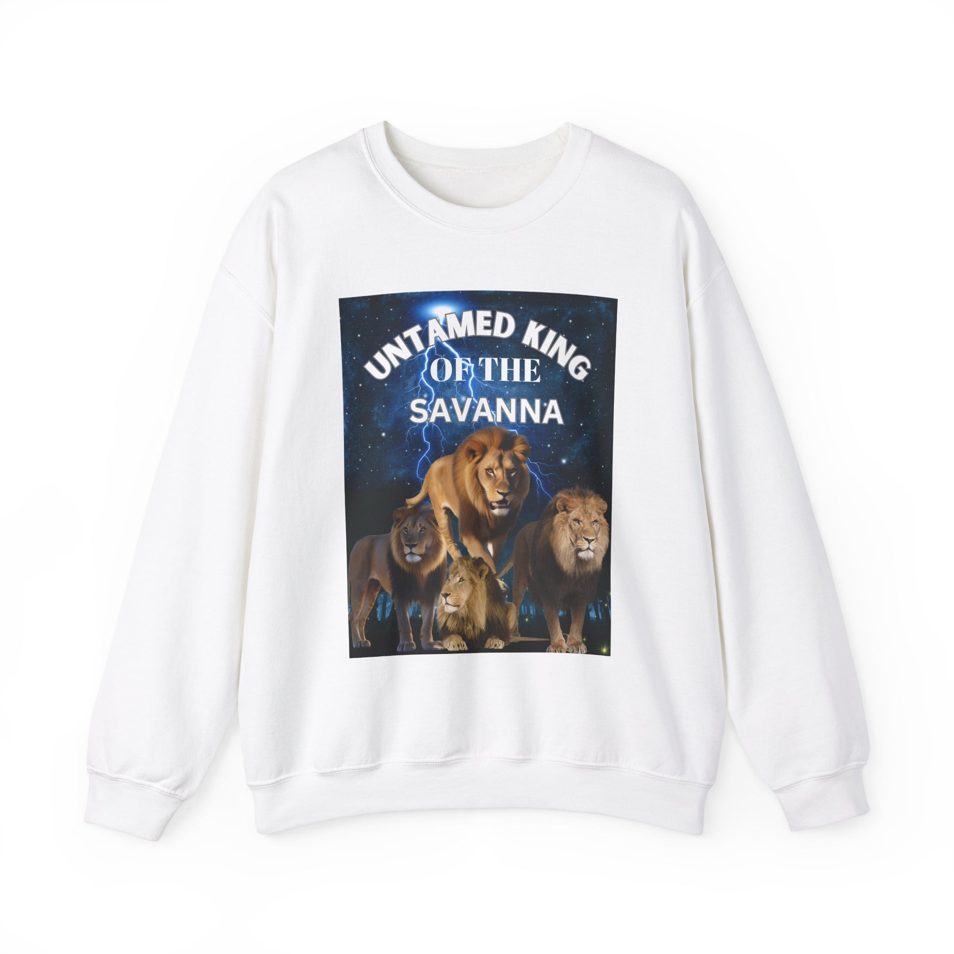 Untamed King of the Savanna Crewneck Sweatshirt - Unisex Heavy Blend. This cozy sweatshirt with a classic fit and crew neckline is perfect for those colder months. The double-needle stitching adds durability while the tear-away label ensures comfort. Ideal for adults who appreciate ethical and sustainable production.