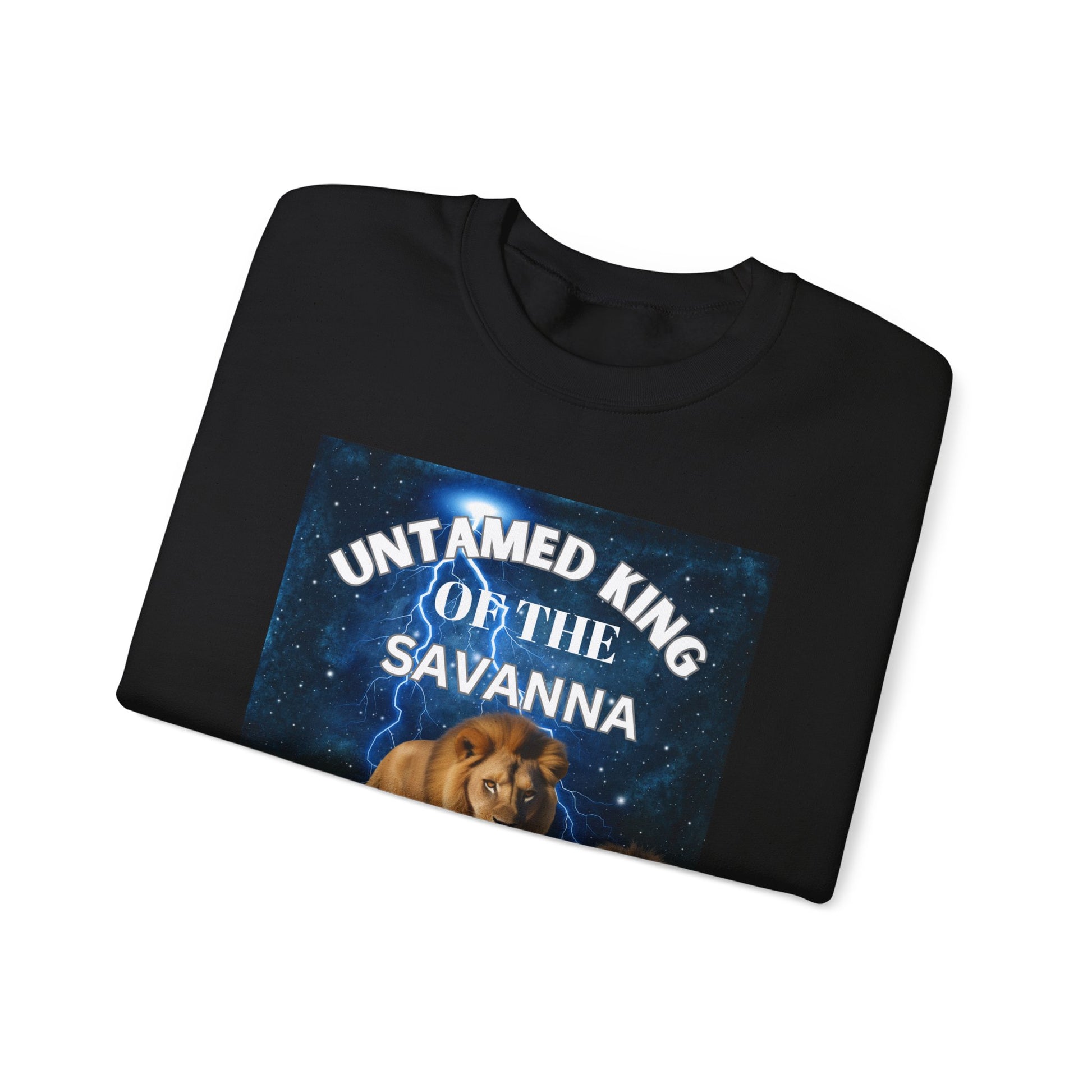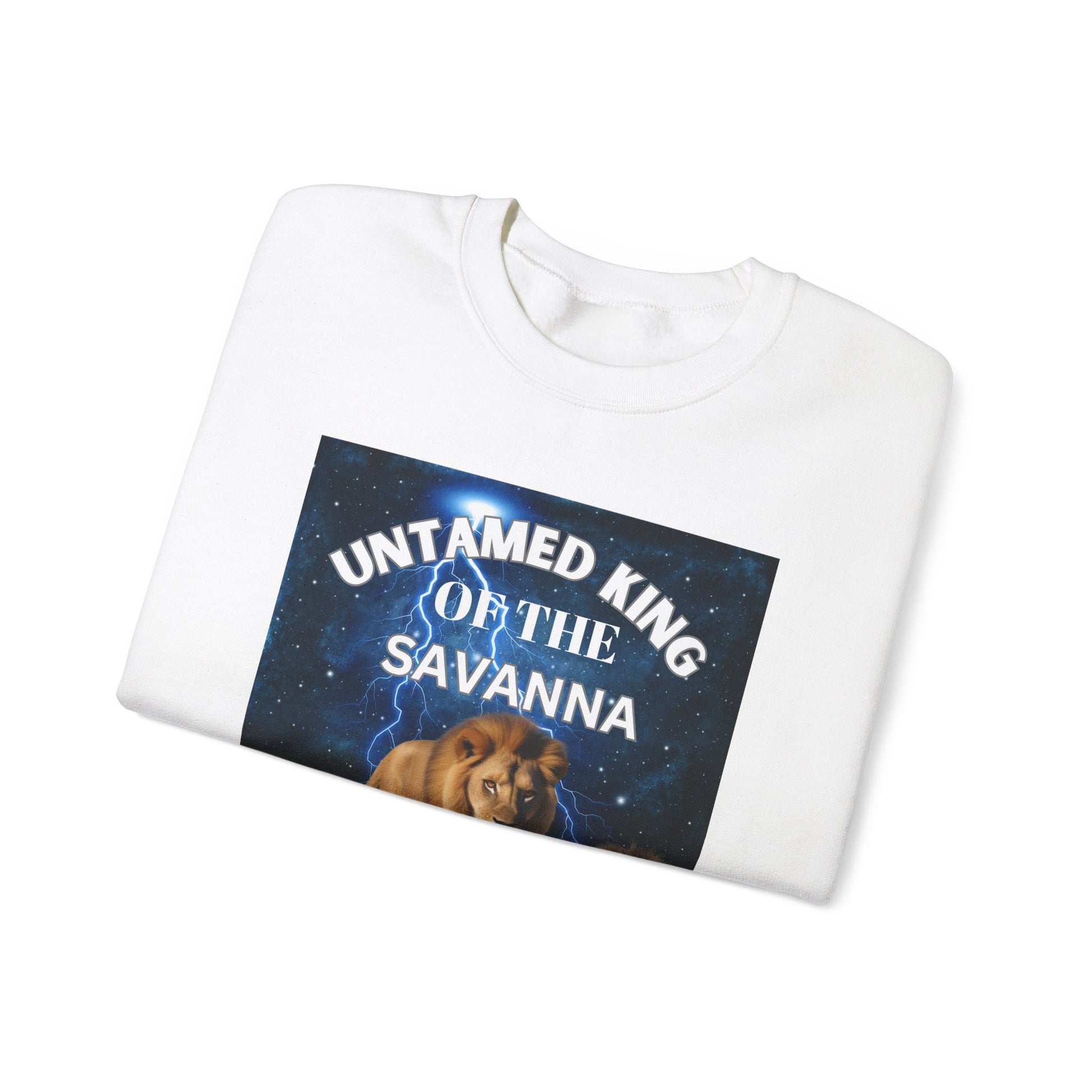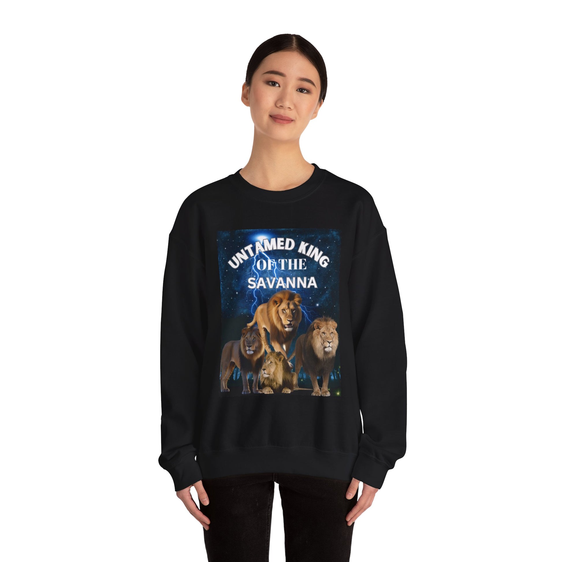 Untamed King of the Savanna Crewneck Sweatshirt - Unisex Heavy Blend. This cozy sweatshirt with a classic fit and crew neckline is perfect for those colder months. The double-needle stitching adds durability while the tear-away label ensures comfort. Ideal for adults who appreciate ethical and sustainable production.